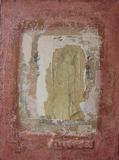 Outre l’intelligente technique fusionnelle de collages et de citations (Anisotropy evolution), ce que j’ai particulièrement apprécié et retrouvé dans l’ensemble de l’œuvre exposée, c’est à la fois l’unité des coloris (des rouges, des ocres, des bruns et des bleus à la manière très évocatrice de Pompéi) et celle des personnages féminins. Tantôt hiératique et solitaire, le dos nu et fermé (Walls computations), tantôt séquentielle et drapée, bras tendus, évoluant alors de concert avec une alter-ego dans un univers mystérieux qui pourrait être africain, indien, asiatique, la femme est bien au centre d’une œuvre qui force la méditation. Son impôt de toujours.